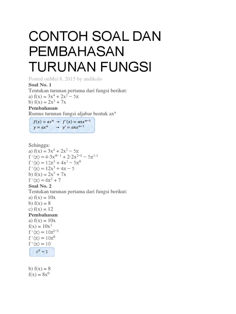 49+ Contoh Soal Turunan Fungsi Pics. Pada umumnya turunan fungsi aljabar ialah materi limit fungsi yang diperluas. Turunan fungsi pertama dari ialah: